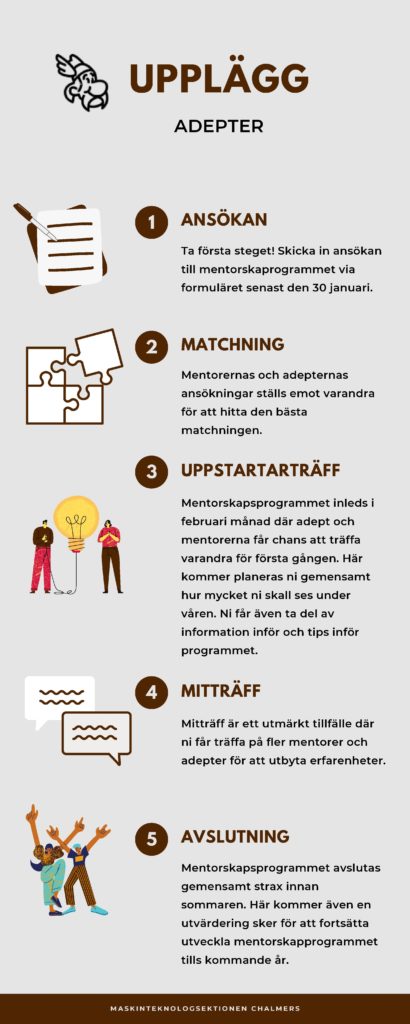 Som adept är tanken att du skall få stöttning och vägledning för din personliga utveckling, samt även få en inblick i hur livet kan se ut efter studierna på Maskinteknik. Mentorskapsprogrammet består utav tre gemensamma träffar (första träffen, mitträff, avslutning) där fokus ligger på att de enskilda mötena mellan båda parter. Adepten fungerar som en moderator i relationen, då dessa träffar skall planeras utav adepten och vad den vill göra samt hur mycket den vill få ut utav dessa möten. För att det skall bli så effektiva möten som möjligt är det viktigt att adepten alltid kommer förberedd till dessa möten.